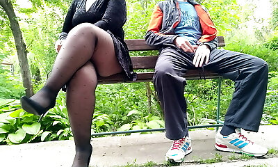 Unfamiliar MILF in pantyhose jacked off my cock in the park on a bench