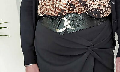 Going to work in a blouse, mini-skirt ,stockings and heels. Ready for my younger chief to inspect my mature orbs, ass and bald cunt.