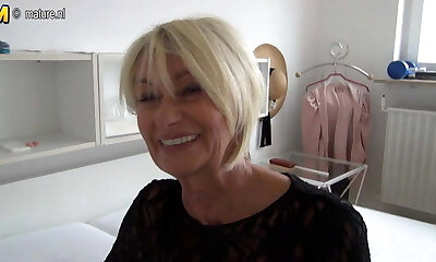 Mother-in-law fucks her hairy pussy with her frigs and gets cum on her gorgeous fat rump at home