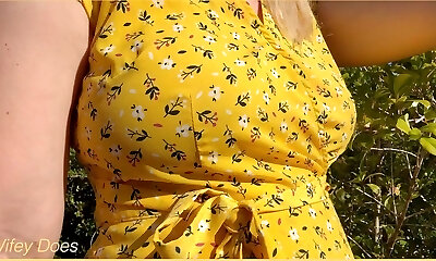 Wife heads out in a cute summer dress braless and looks awesome with her blonde hair.
