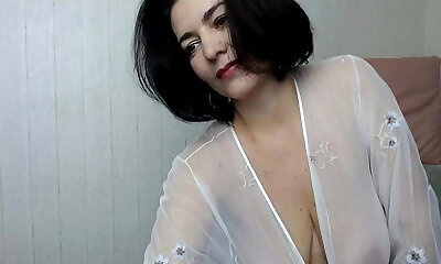 Solo striptease stroking and fingering of nasty mature lady with huge natural tits